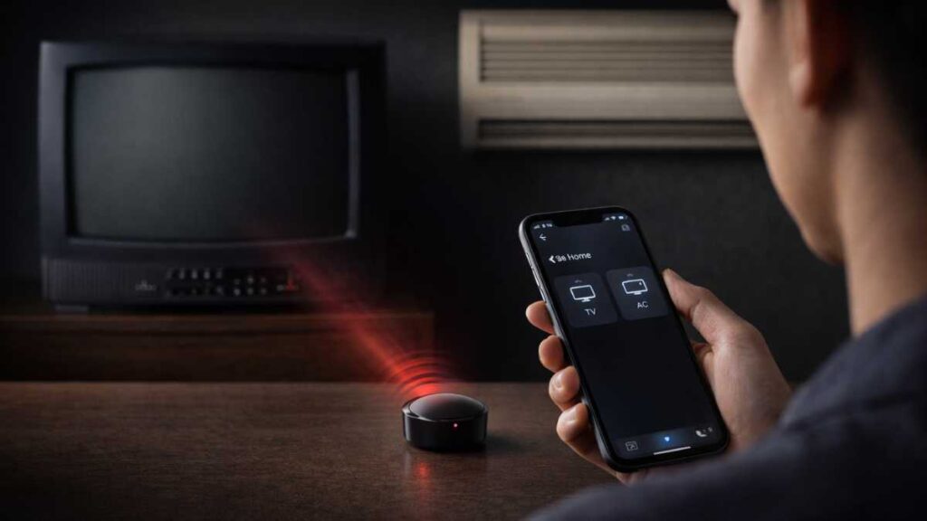 Dispositivos infravermelhos inteligentes replicam os comandos do controle remoto original, permitindo automação sem trocar o aparelho.