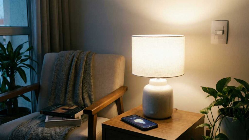 Nem toda iluminação precisa estar no teto. Abajures, luminárias de chão e luzes auxiliares são ótimos alvos para automação com plugues inteligentes.